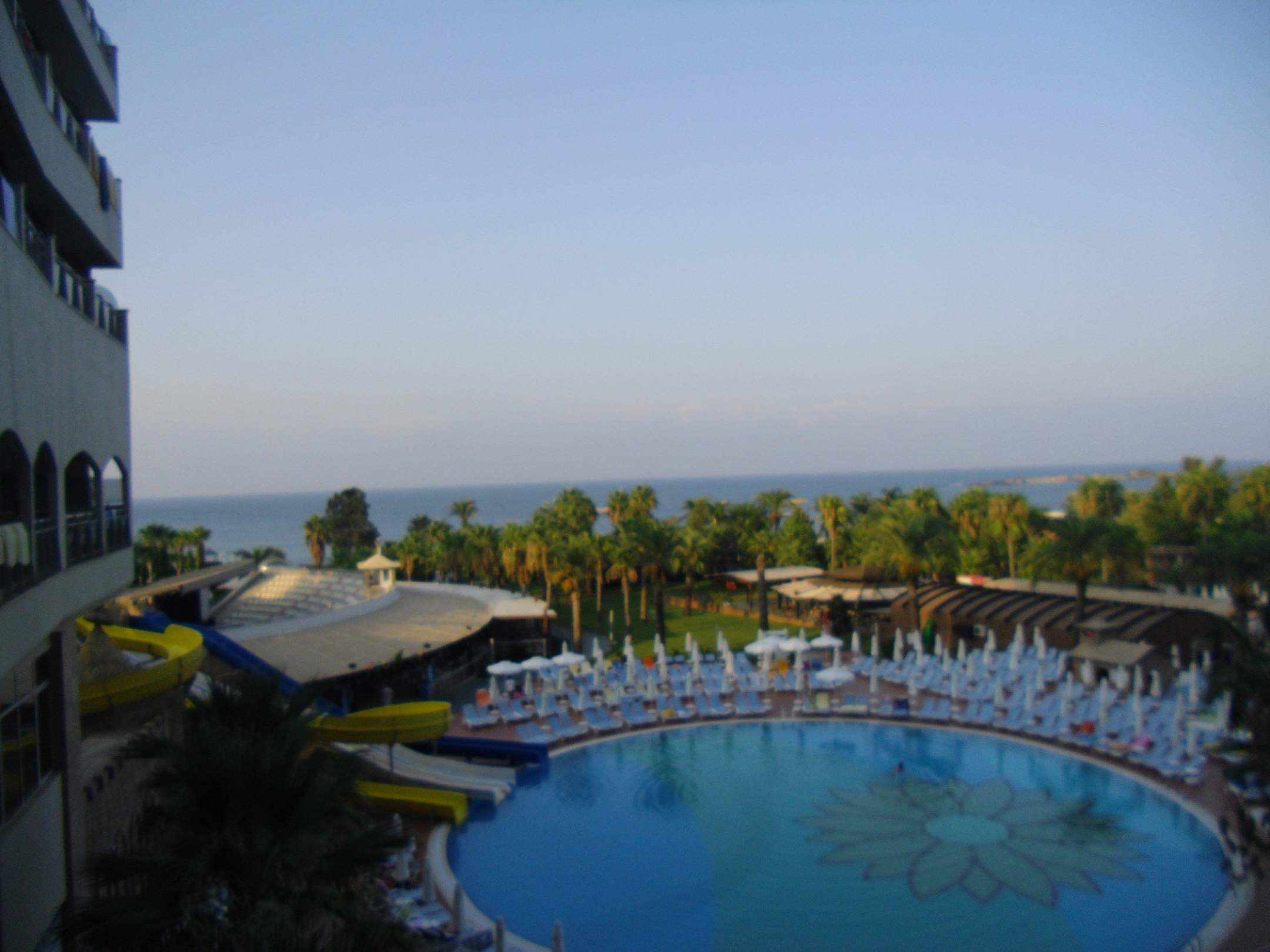 Aussicht vom Zimmer auf die Poolanlage und das Meer früh Morgens um 6:00Uhr