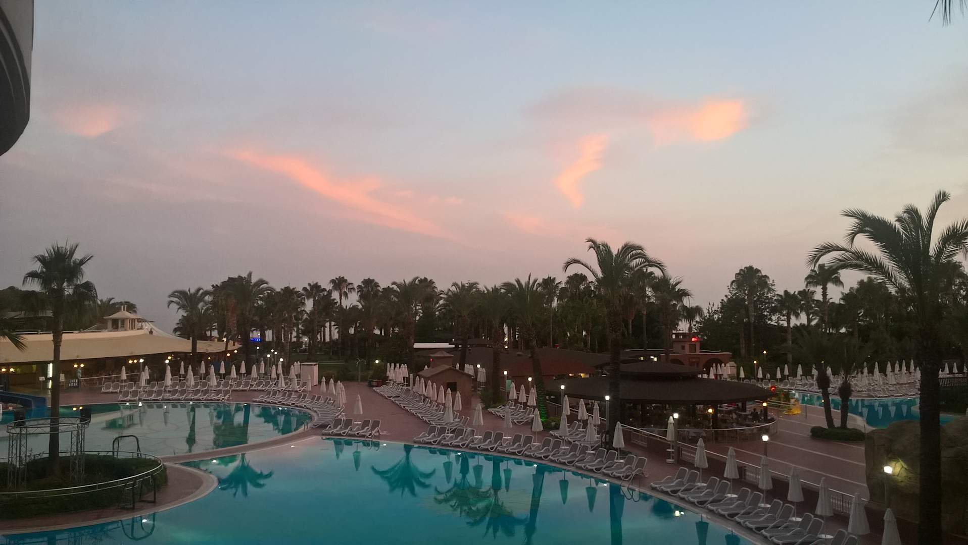 Sonnenuntergang und mehr vom PoolLinks kann man um die Insel herum schwimmen. Alles zusammen ist ein großer Pool.