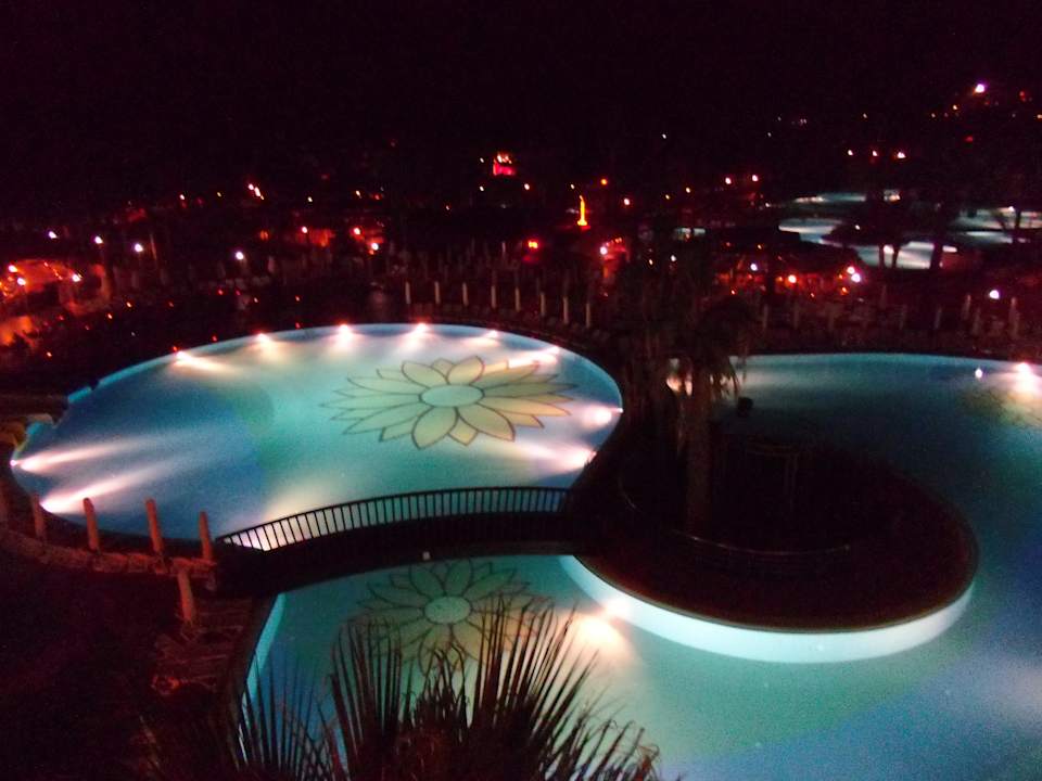 Aussicht vom Zimmer aus auf die Anlage am Abend