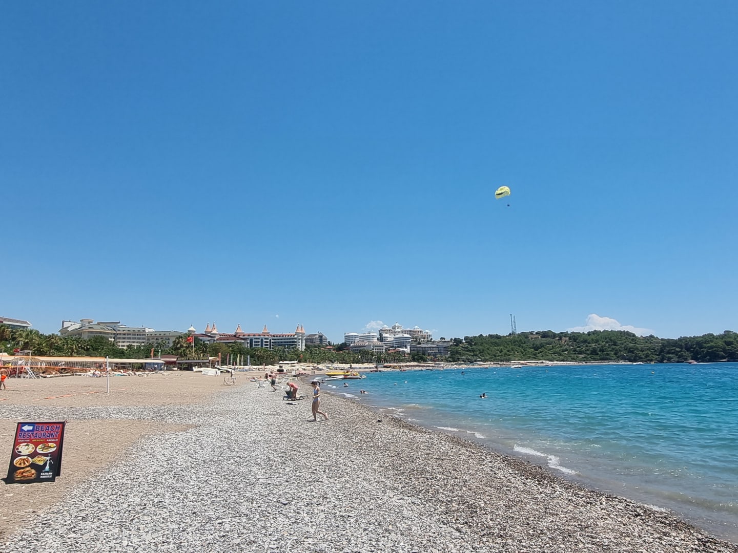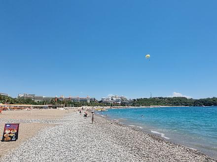 Strand mit etwS viel Kies mit Blick auf unser Hotel