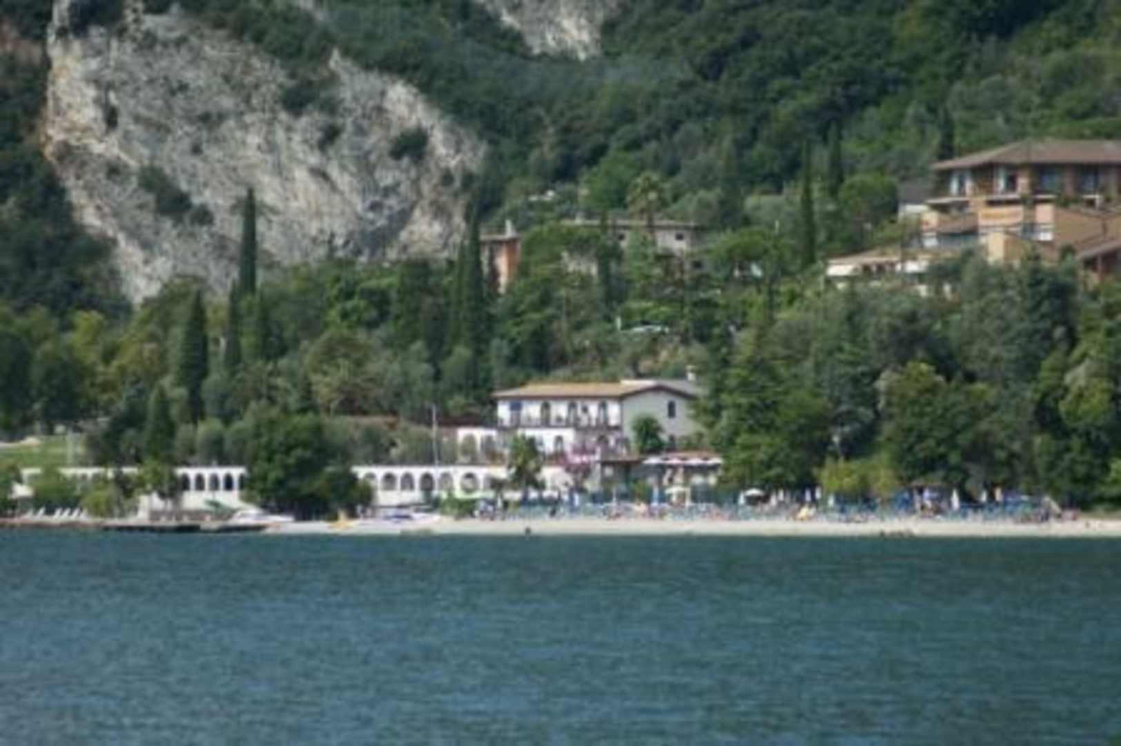 im Vordergrund die Villa Lucia mit Strand. Dahinter der Hauptkompex