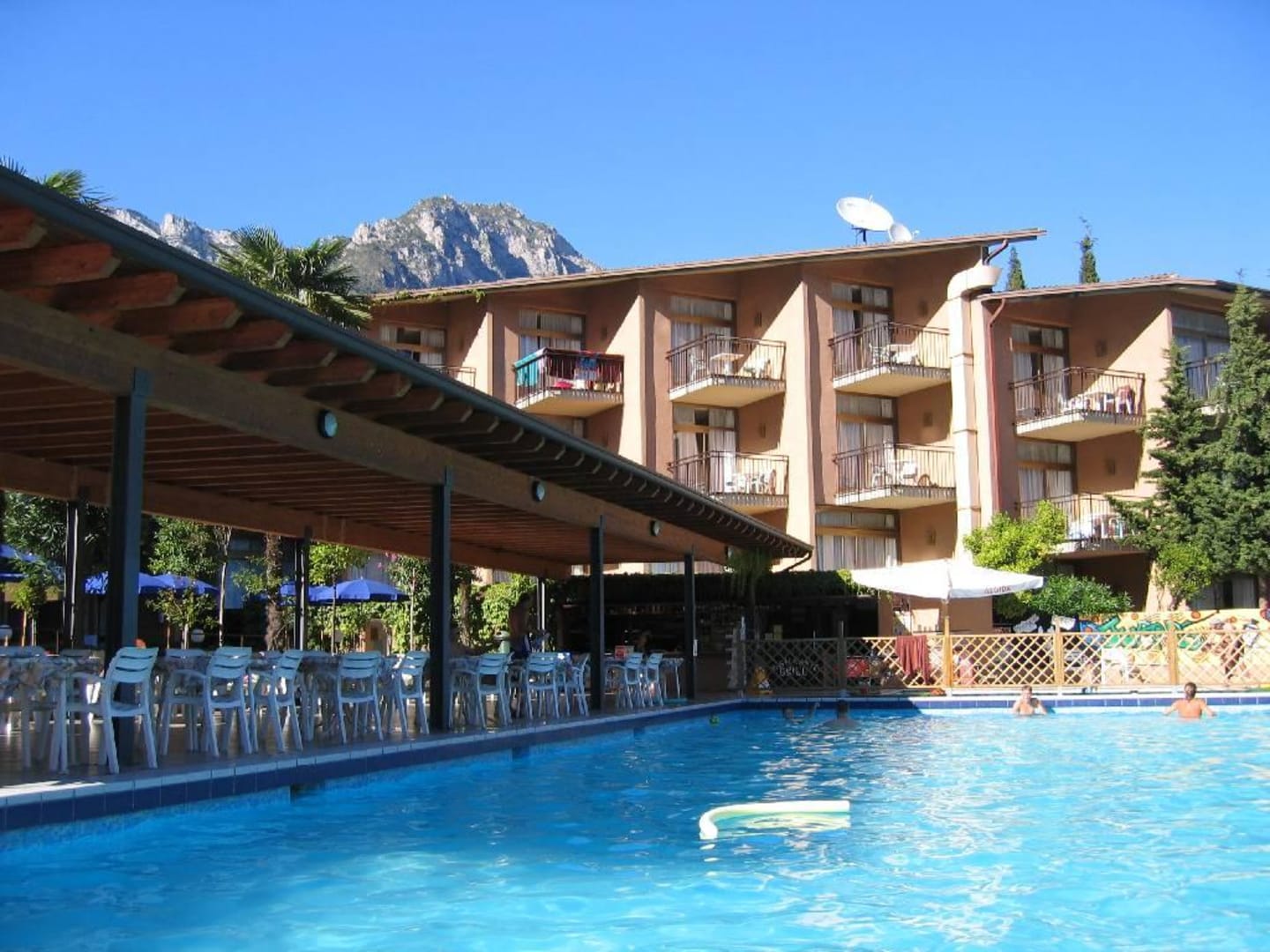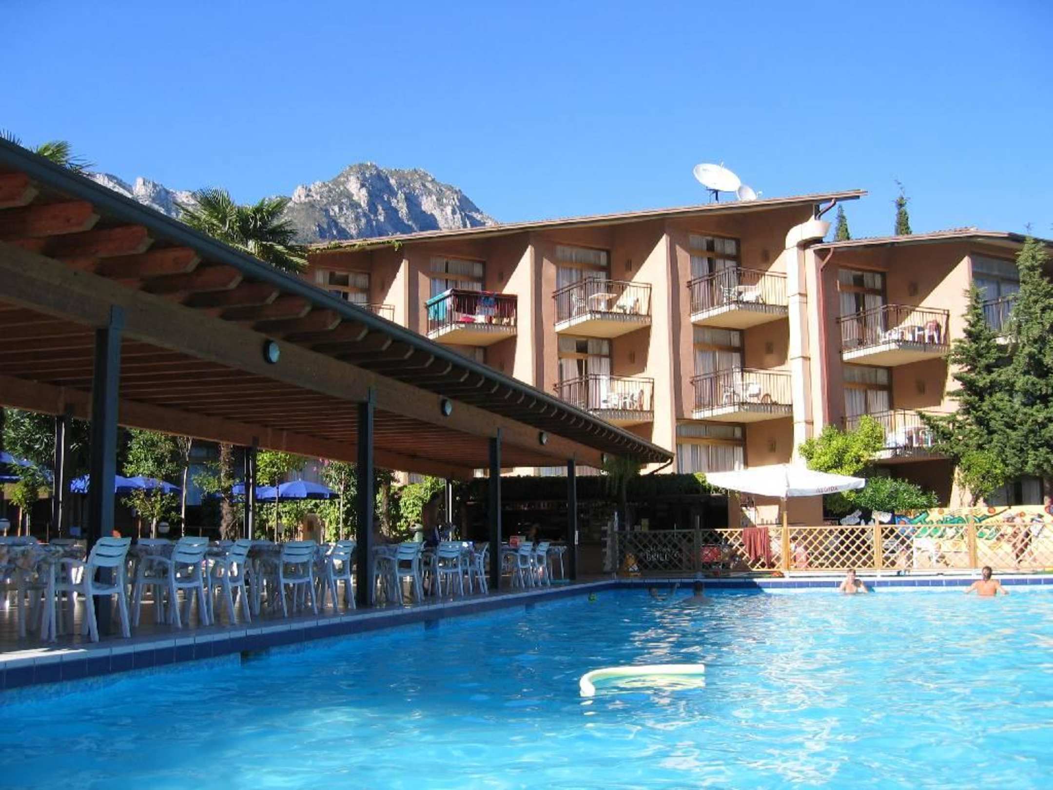 Hauptgebäude und Pool mit Außengastronomie