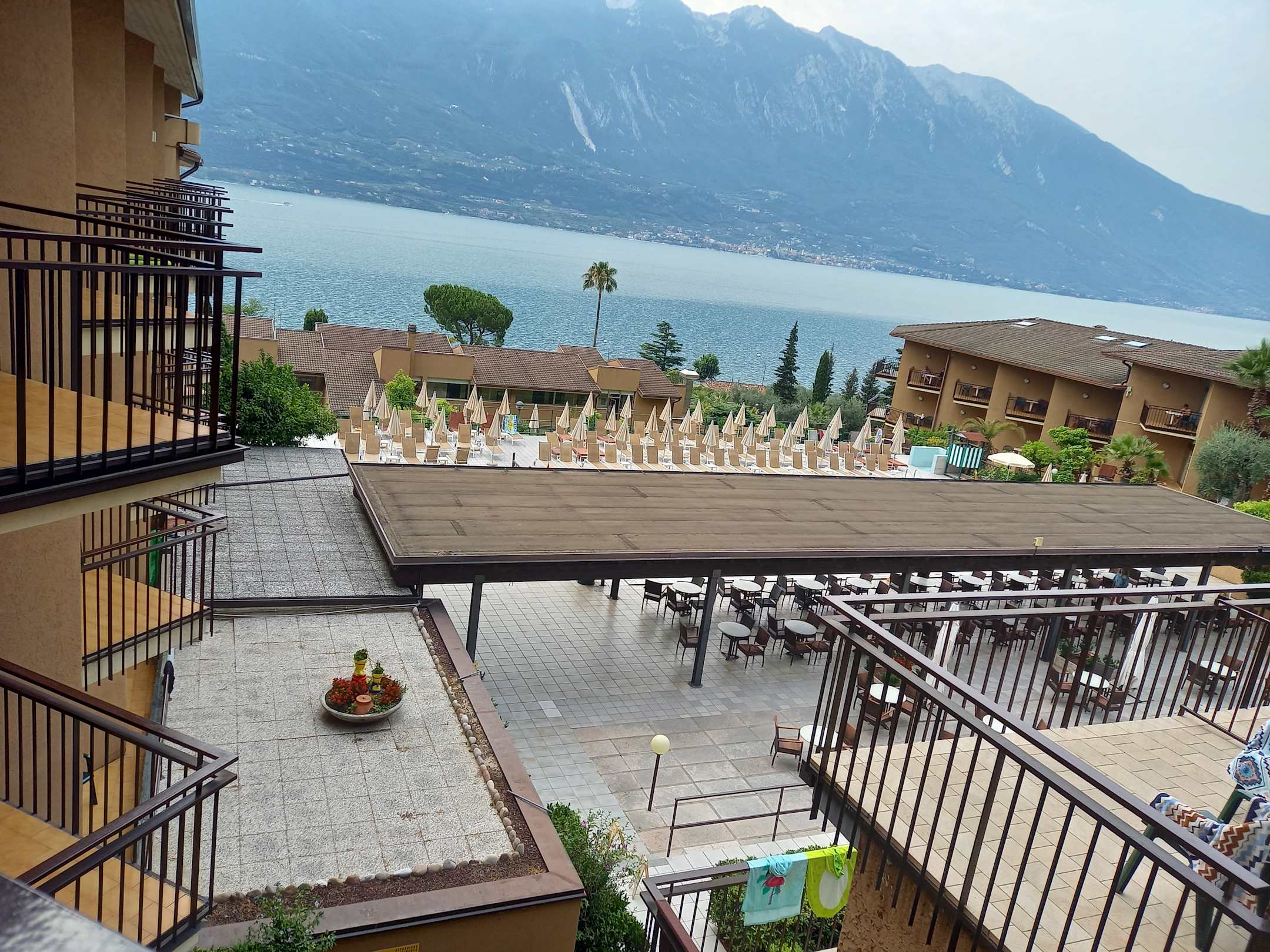 Außenansicht von den Nebengebäuden auf den Pool, Gardasee und das Hauptgebäude.