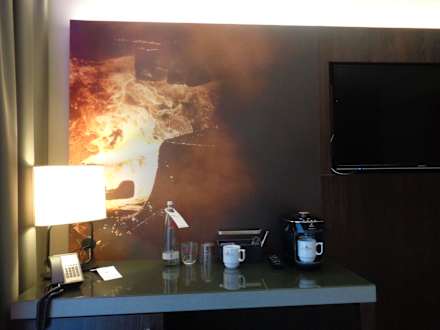 ZimmerSchreibtisch mit Telefon, Lampe, Kaffee- und Teebereiter und kostenloser Flasche Wasser.