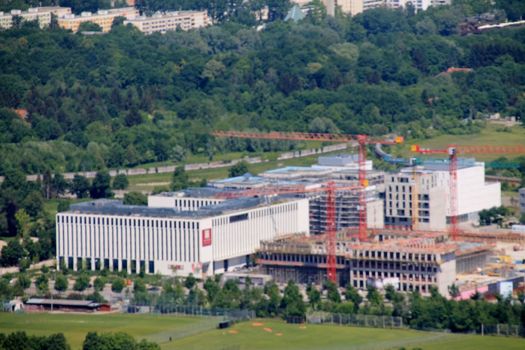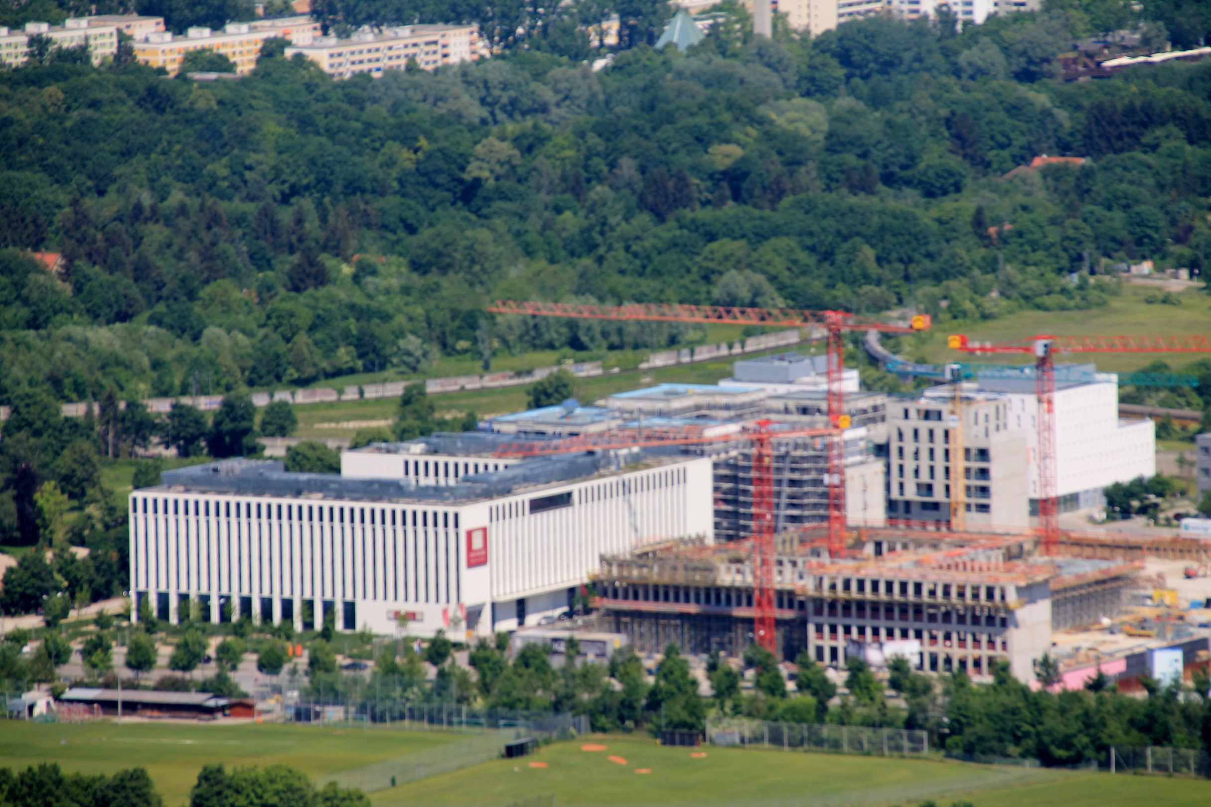 Blick vom Olympiaturm zum Hotel und Baustellen