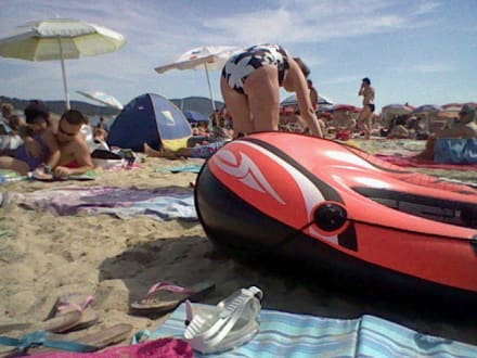 Das Bild lässt die chaotischen Zustände am Strand nur erahnen. Das Schlauchboot gehört nicht zu uns, sondern zum Nachbarplatz!!!