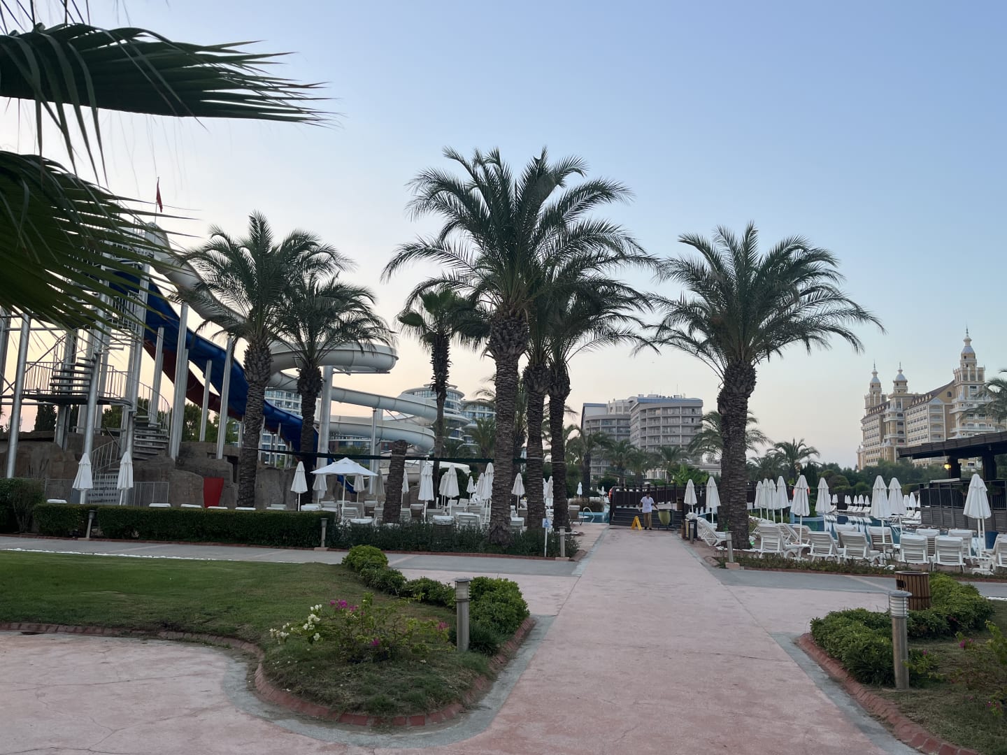 PoolBlick vom Strand in Richtung Poolanlage und Hotelgebäude. Links im Bild sieht man die drei Rutschen