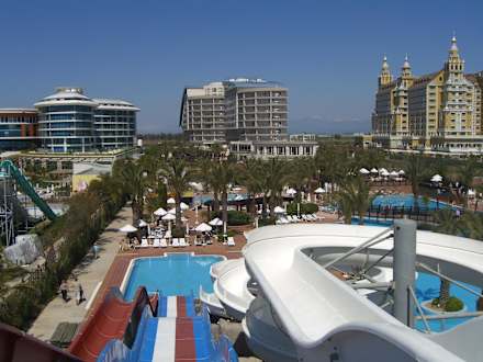 Von der Rutsche auf das Hotel (Bildmitte)