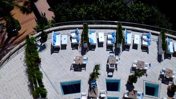 Blick aus der 4. Etage auf die Terrasse neben der Lobby