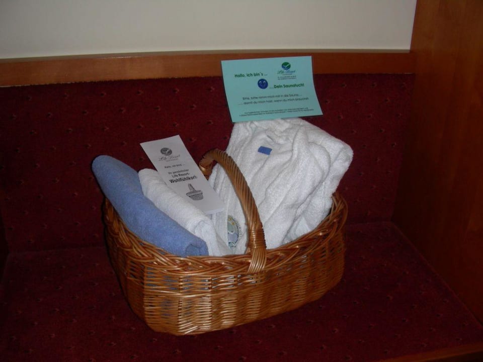 Wellnesskorb2 Handtücher, 1 Bademantel, Schuhe, und die tägliche Informationsbroschüre waren darin enthalten.