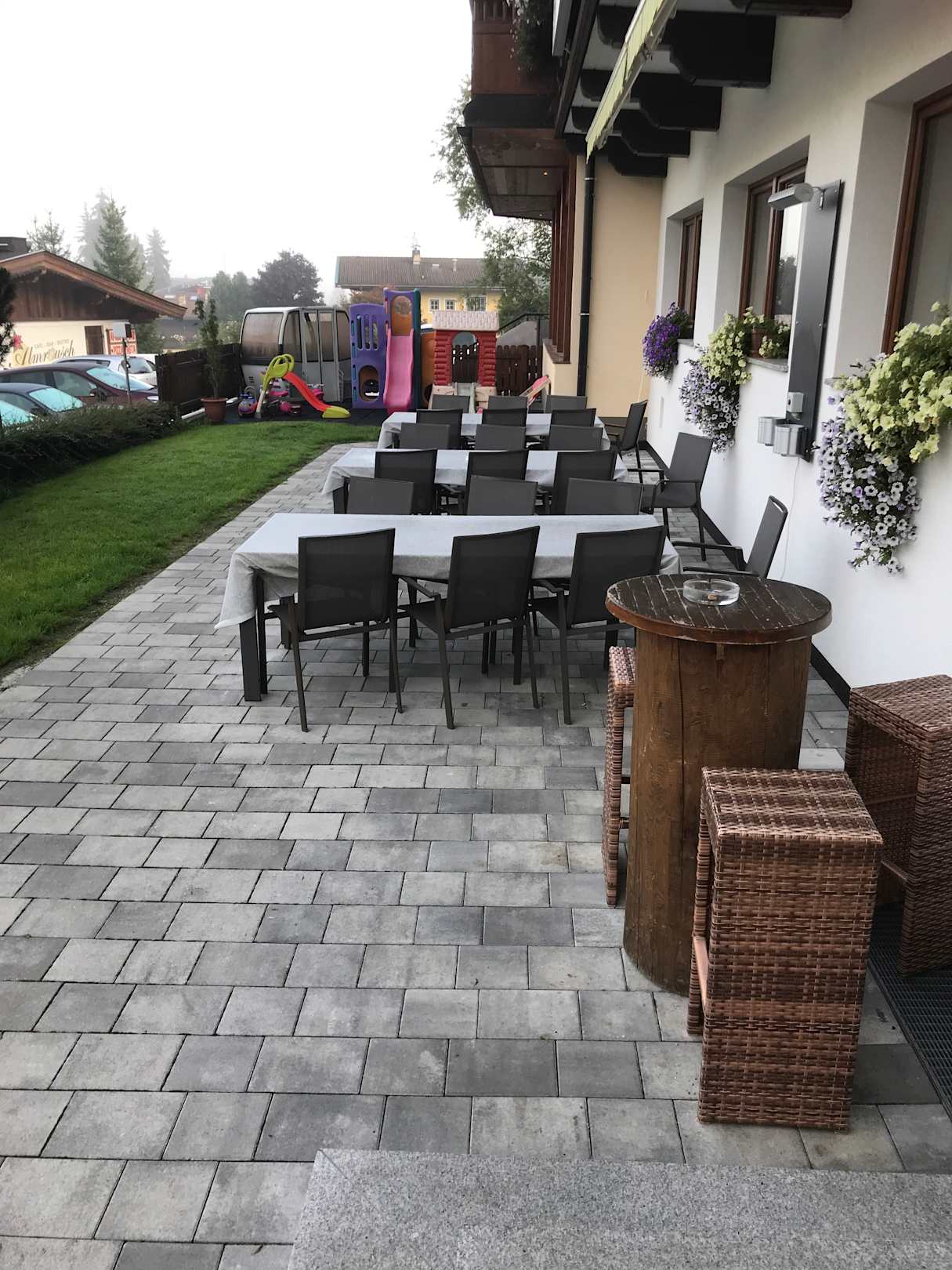 GastroSchöne Sitzgelegenheiten draußen. Konnten sie leider nicht nutzen. Wir hatten regen und es war sehr kühl.