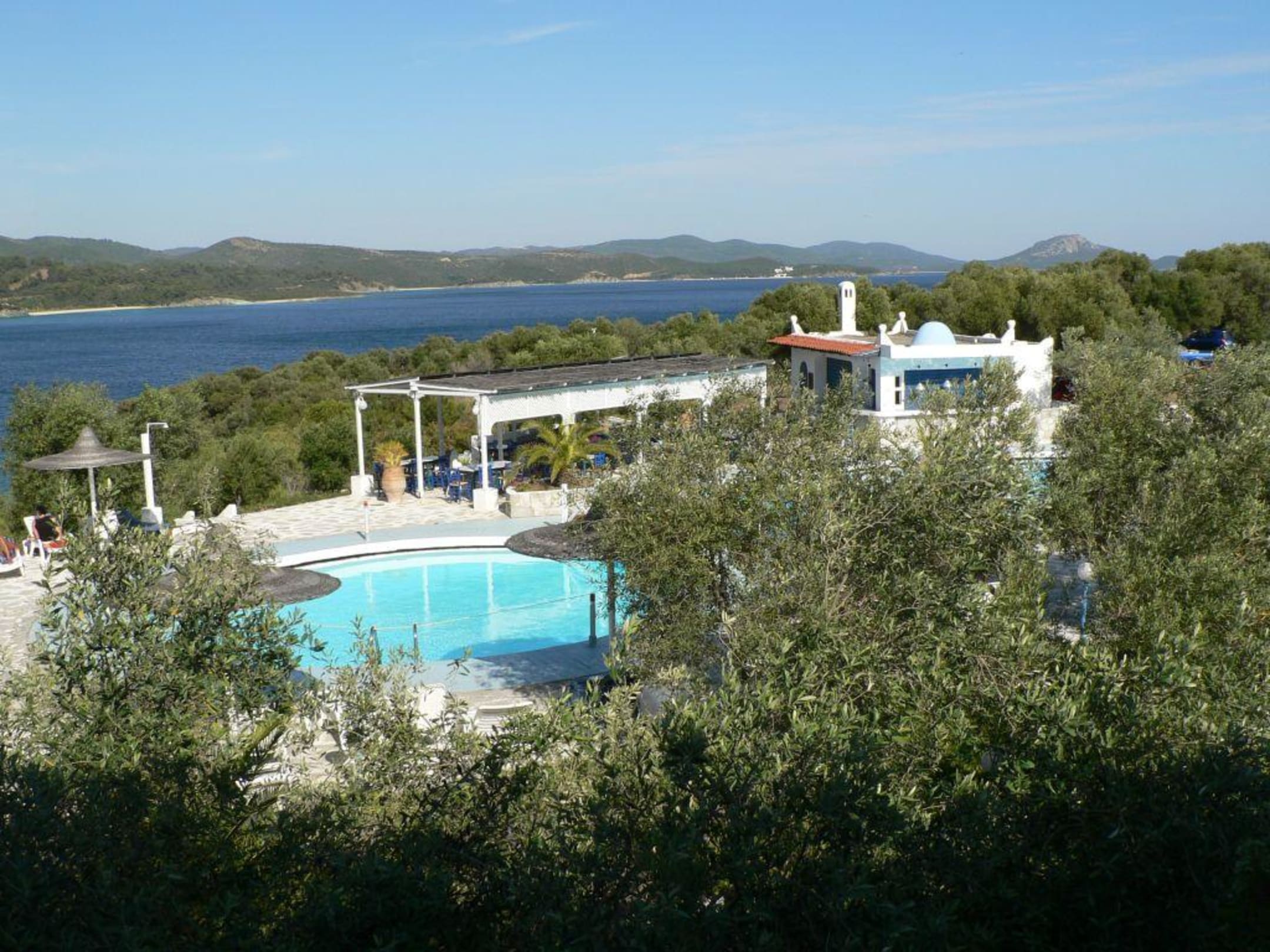 Blick vom Balkon unseres Zimmers auf den Pool, die Poolbar und das Meer