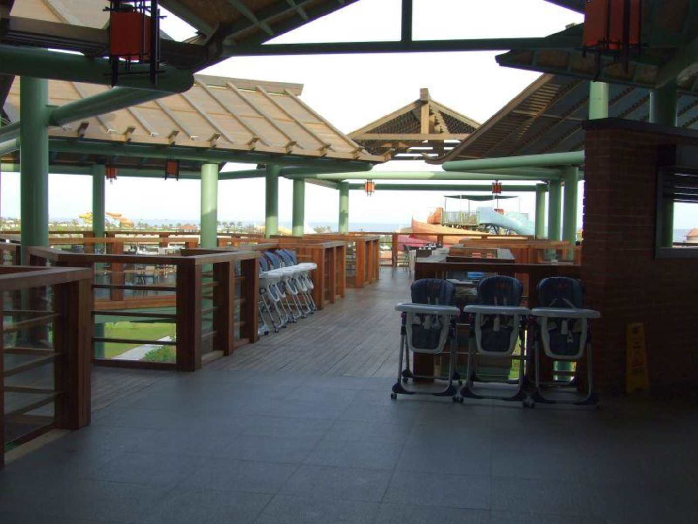 Außenbereich Zen RestaurantHier kann man einen Teil des Außenbereichs erkennen. Man kann dort mit etwas Glück einen schönen Tisch mit Blick zum Meer oder Pool ergattern. Leider sind diese Plätze sehr begehrt, so dass man oft in einem anderen Teil sitzen muss. Aber auf alle Fälle gibt es genügend Kindersitze (wie man sehen kann).