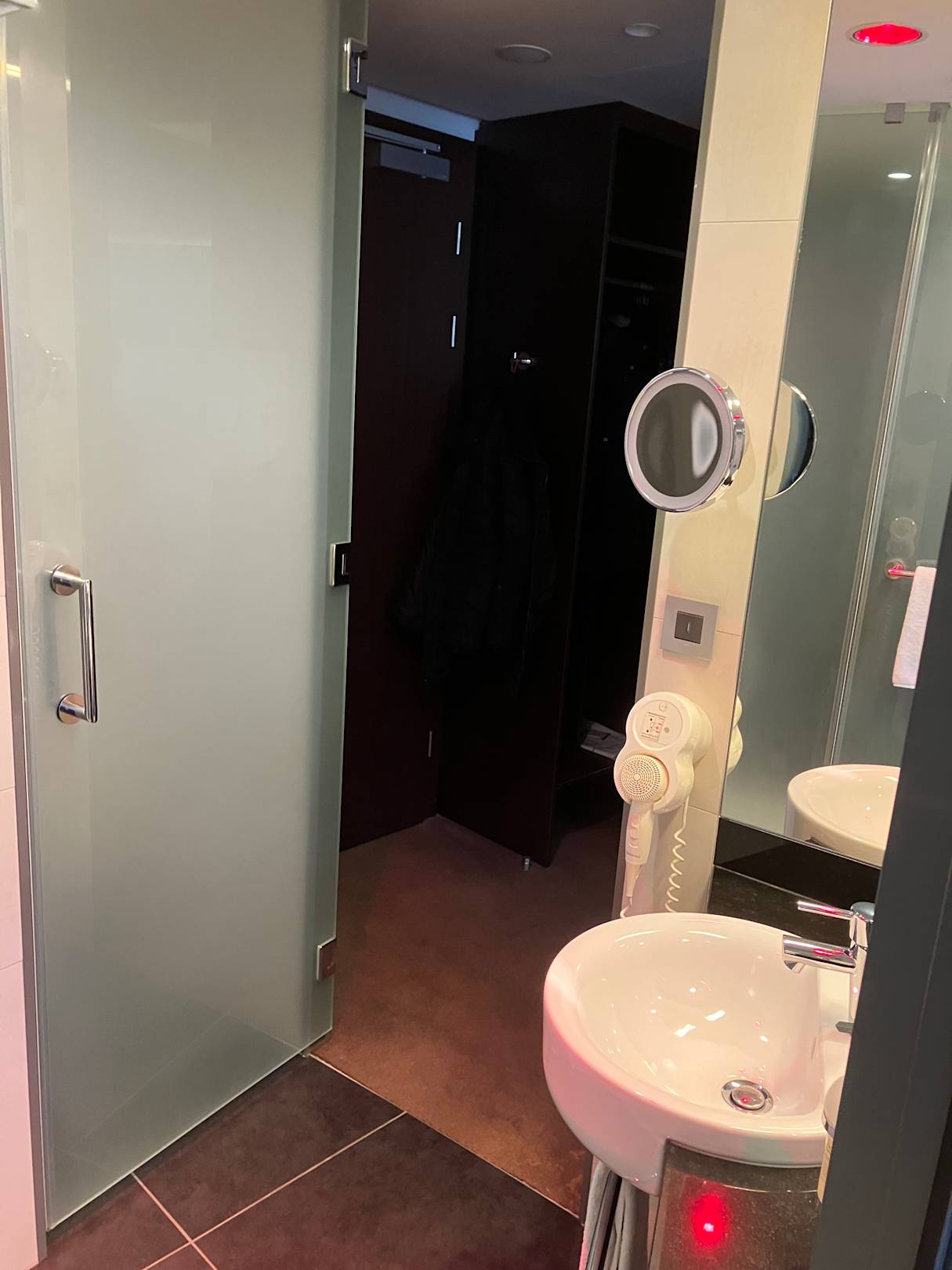 Schließt man die Türen nach außen zum Zimmer, sind zwar Dusche und WC offen, das Bad aber als großes Zimmer geschlossen.