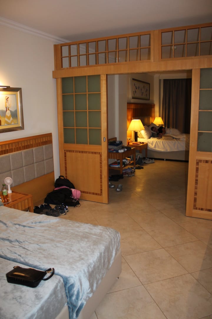 Familienzimmer mit Meerblick, optisch durch Schiebtür getrennt.