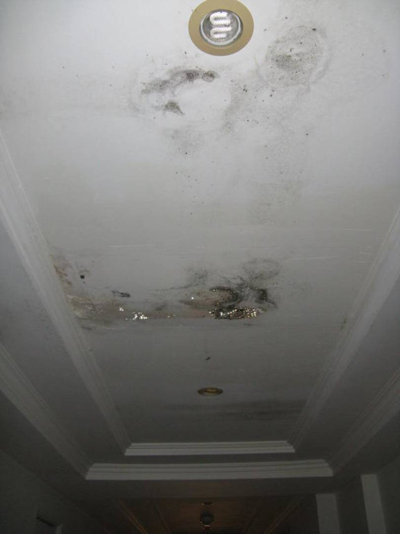grzyb i wilgoć na suficie korytarza (obok pokoi (nr 1001 do 1029).