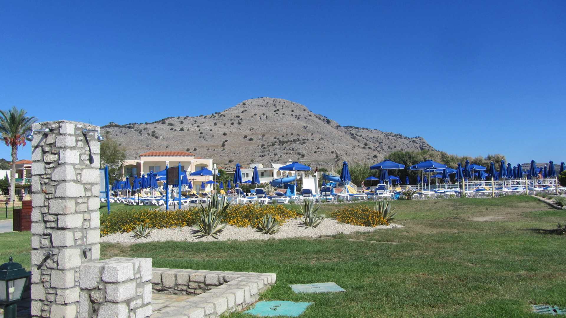 Duschen am Strand, dahinter Pool mit Rutschen