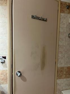 Badezimmertür, die anscheinend ausgebessert wurde, aber den Fleck eigentlich nur verschlimmert hat