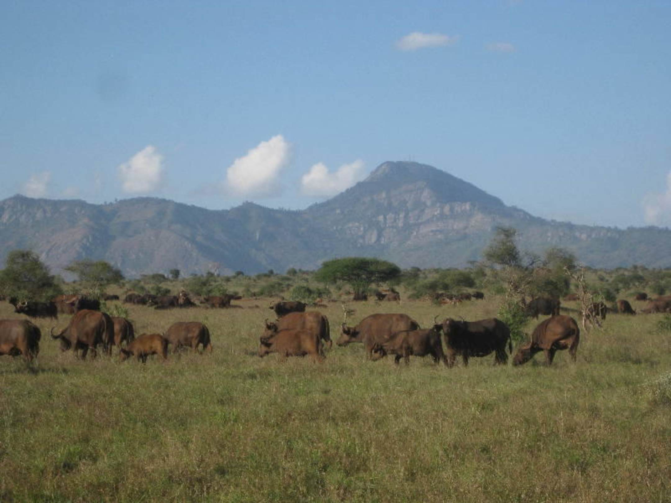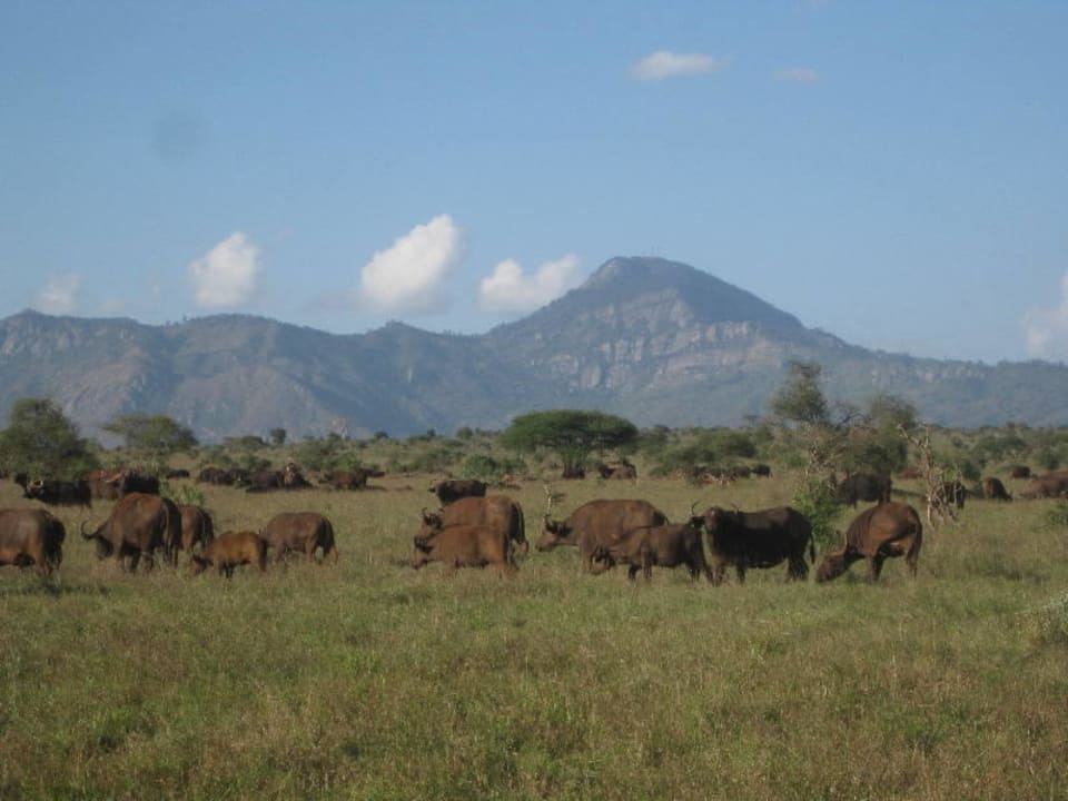 Büffelherde mit den Taita Hills im Hintergrund