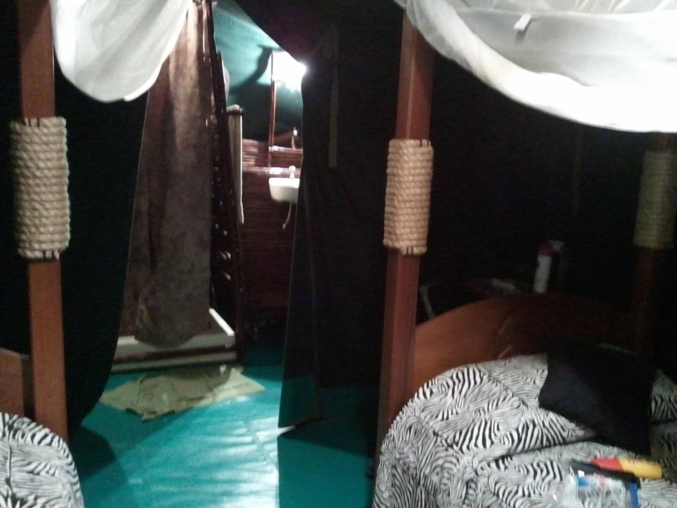 Unser Zelt m it Blick auf den Sanitärbereich. Rechts Waschbecken, Mitte Dusche mit Warm/Kalt Wasser, ganz links (nicht zu sehen) Toilette. Alles picobello sauber und funktionstüchtig