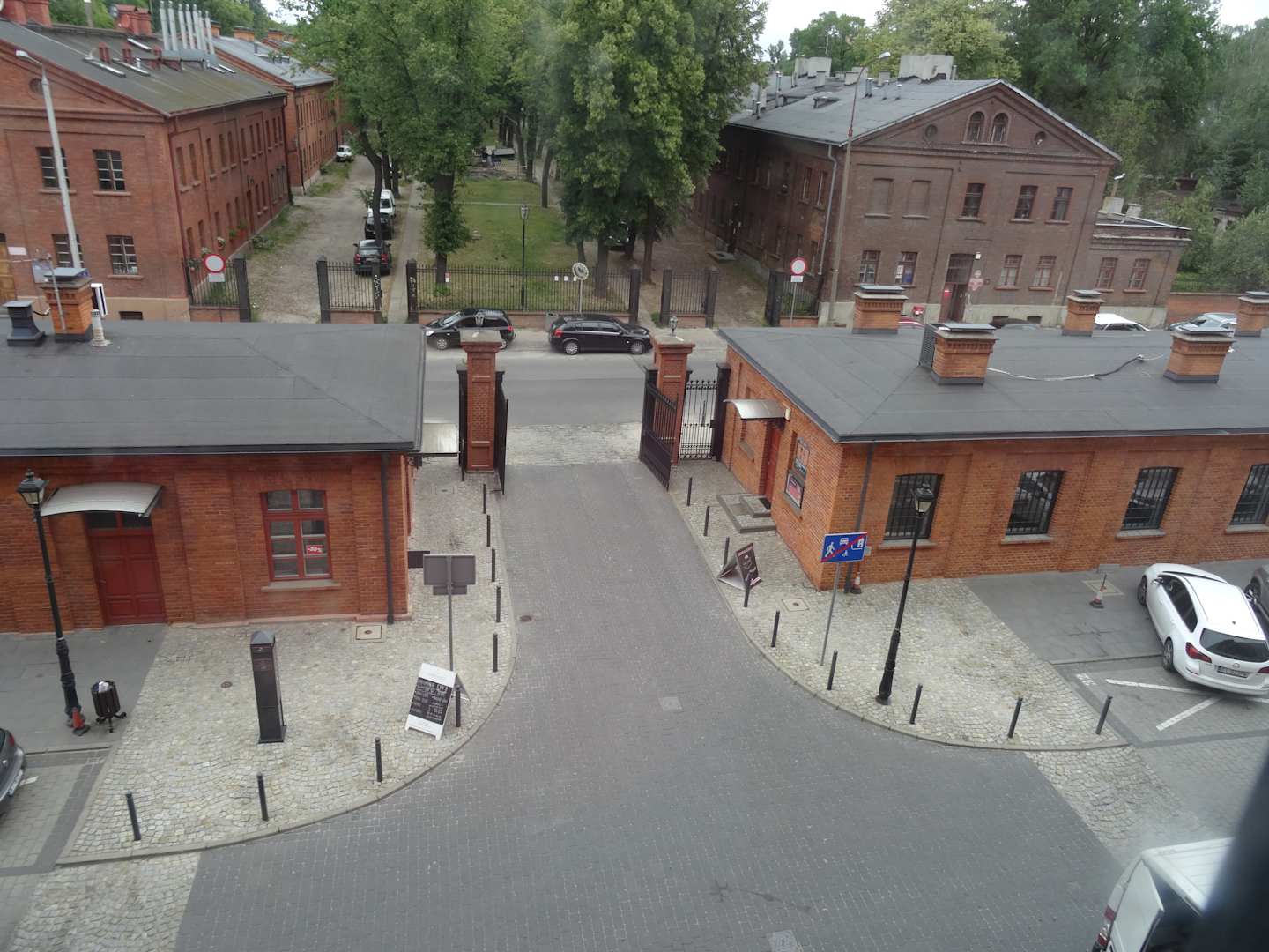 Blick aus dem Frühstücksraum auf das Eingangstor zum Hotel-Areal
