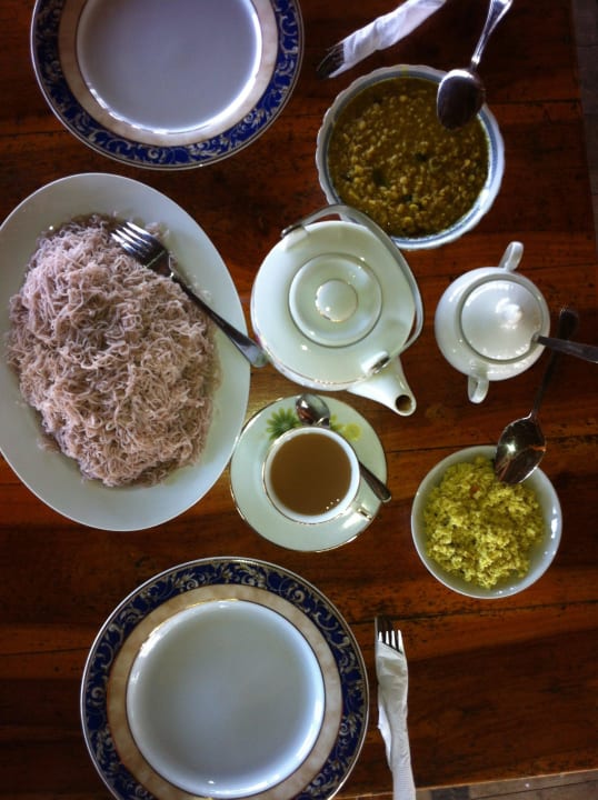 String Hoppers, Sambal, Dhal und Tee, die Früchte kommen dann später