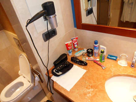 WaschbeckenWaschbecken mit Blick nach links, dort steckt der Fön in einer Metallschlaufe.