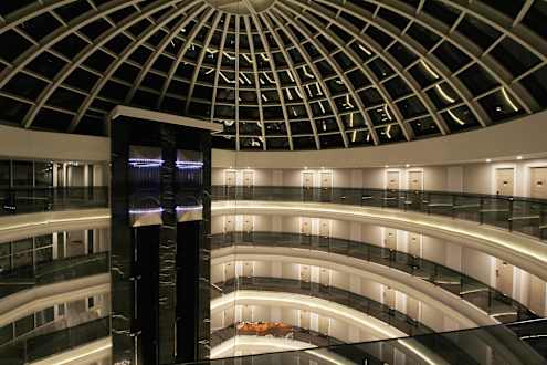 Eingangshalle mit Auzfzügen, bei Nacht