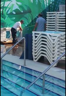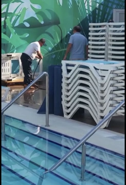 PoolHier wurden nachmittags während des Aufenthaltes 4 Stunden lang lautstark die Liegen eingesammelt und gesäubert.