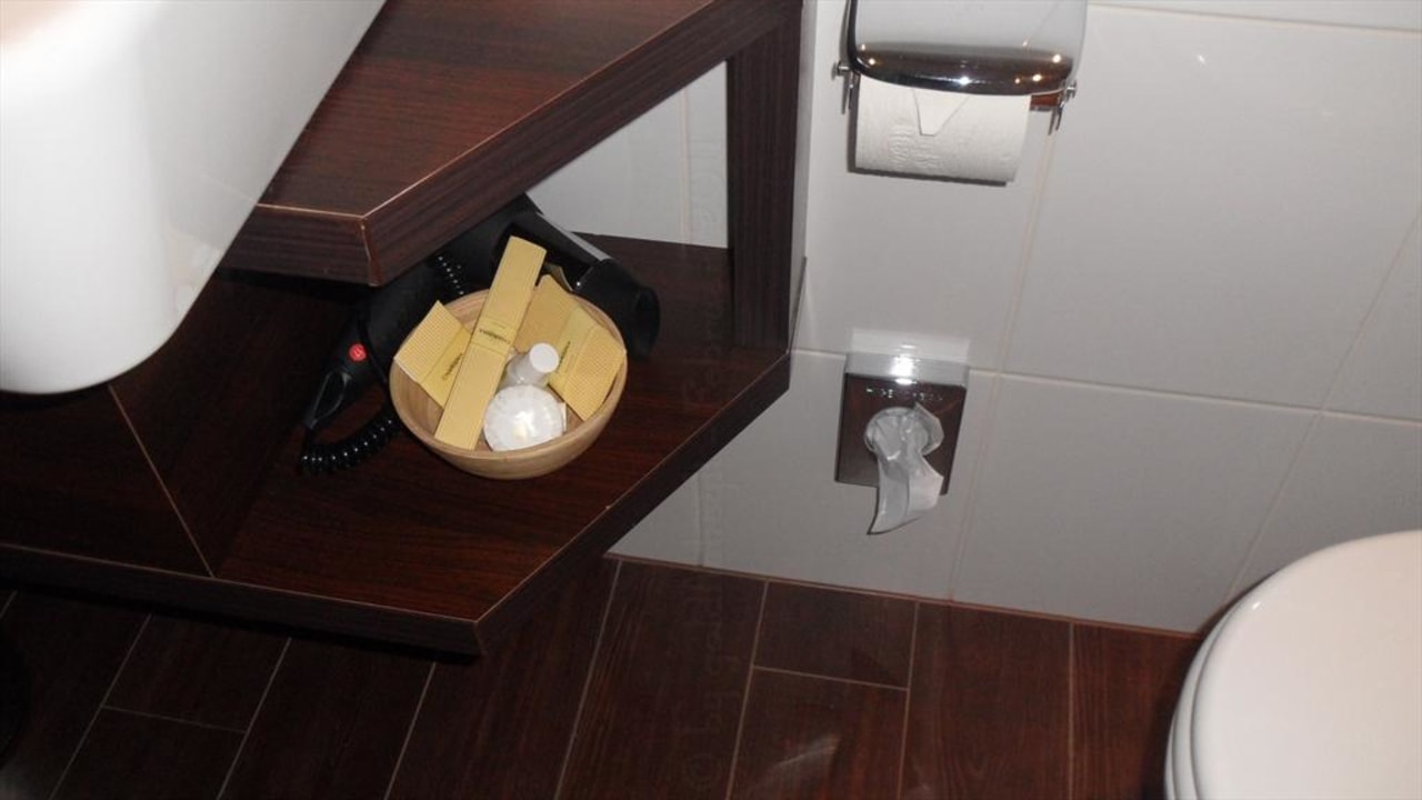 Im Bad Zimmer 5 - Hochtiedsstuv Ablagefläche im Bad unter dem Waschbecken mit Zweitföhn sowie Schale mit Duschzubehör.....