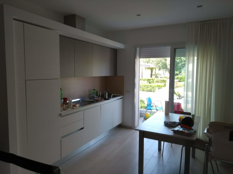 ZimmerBlick auf die Küche mit Esstisch und Terrasse.