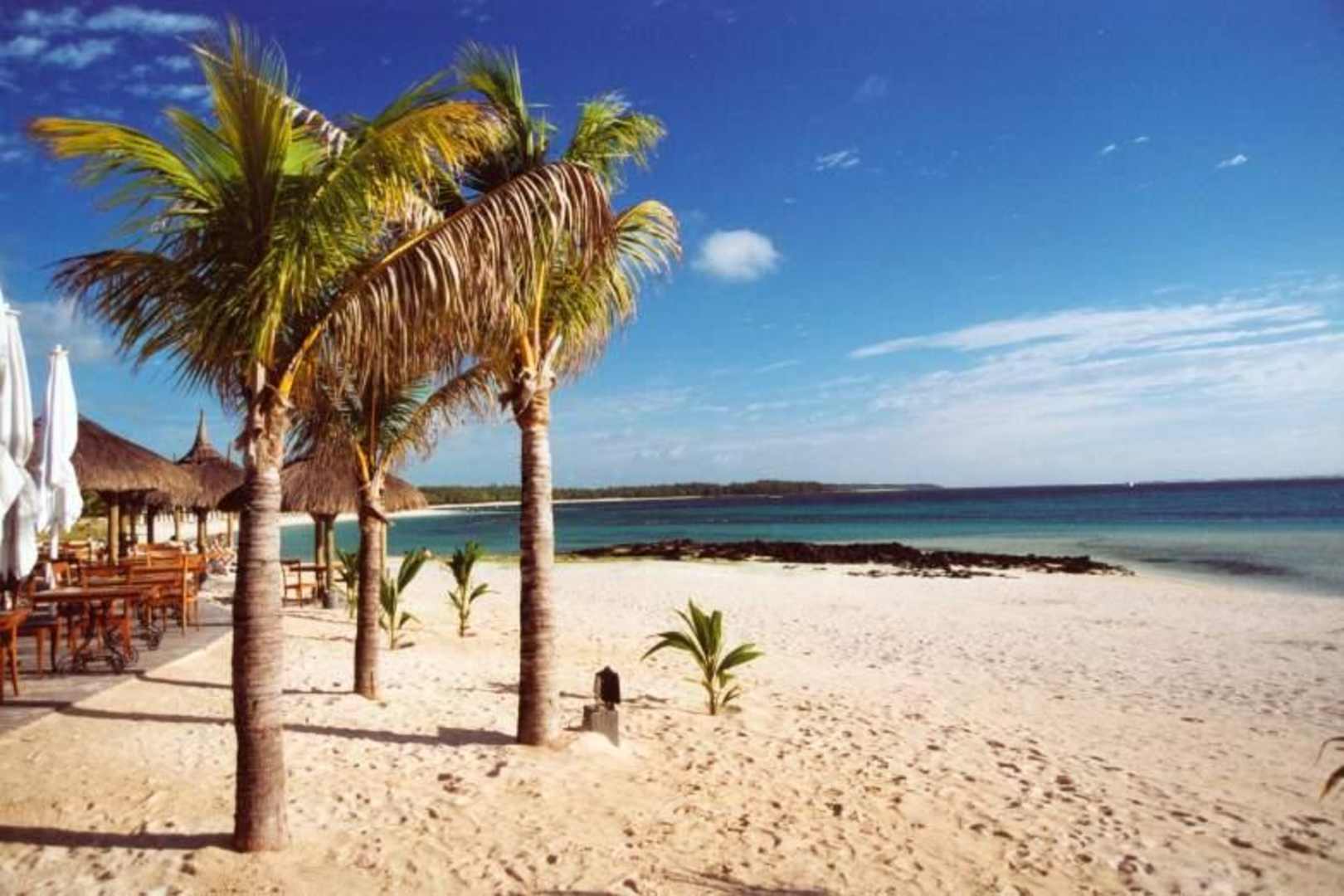 Hotel Beau Rivage, Mauritius Strand direkt vor dem Hotel, Sicht richtung Norden. Der kilometerlange Sandstrand lädt zu Spaziergängen und zum Joggen ein.
