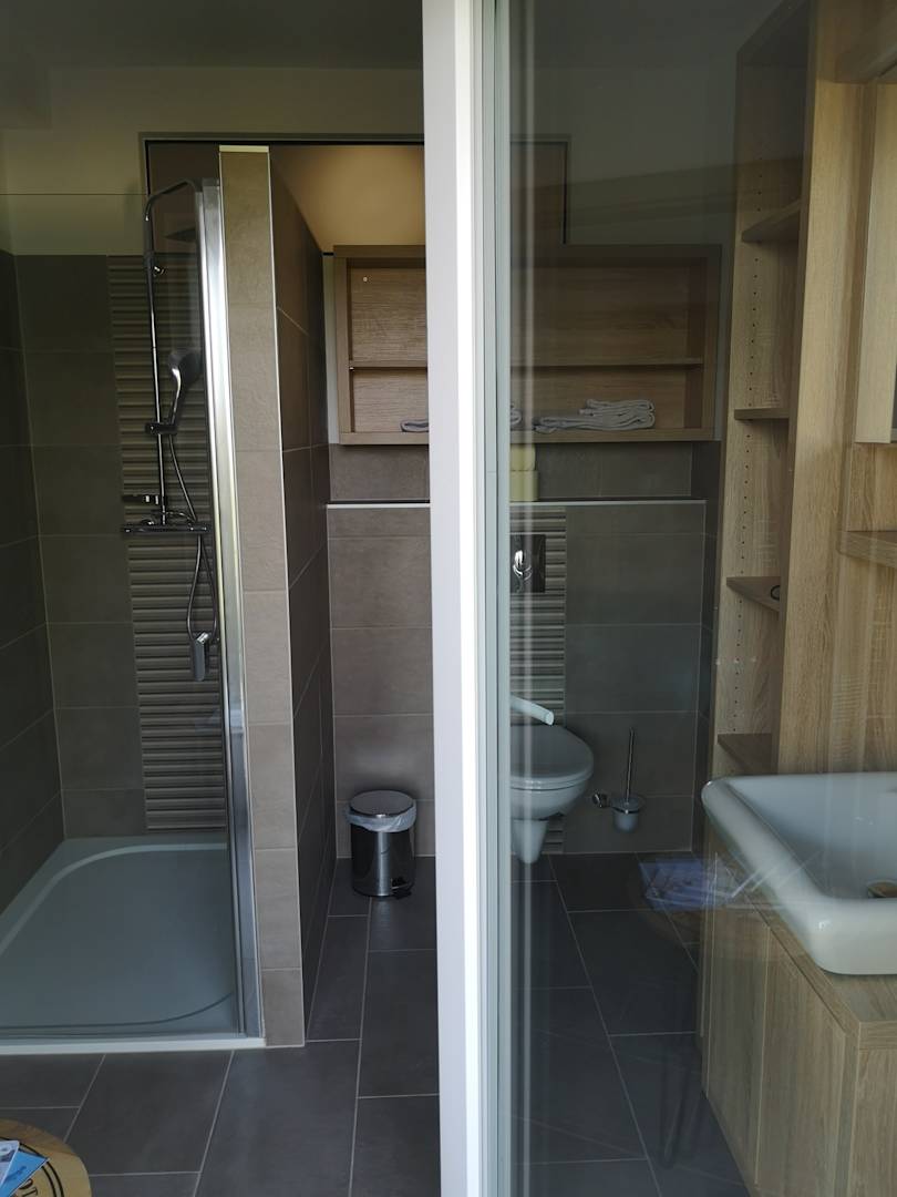 Bad. Der Blick von der Terrasse ins Badezimmer.