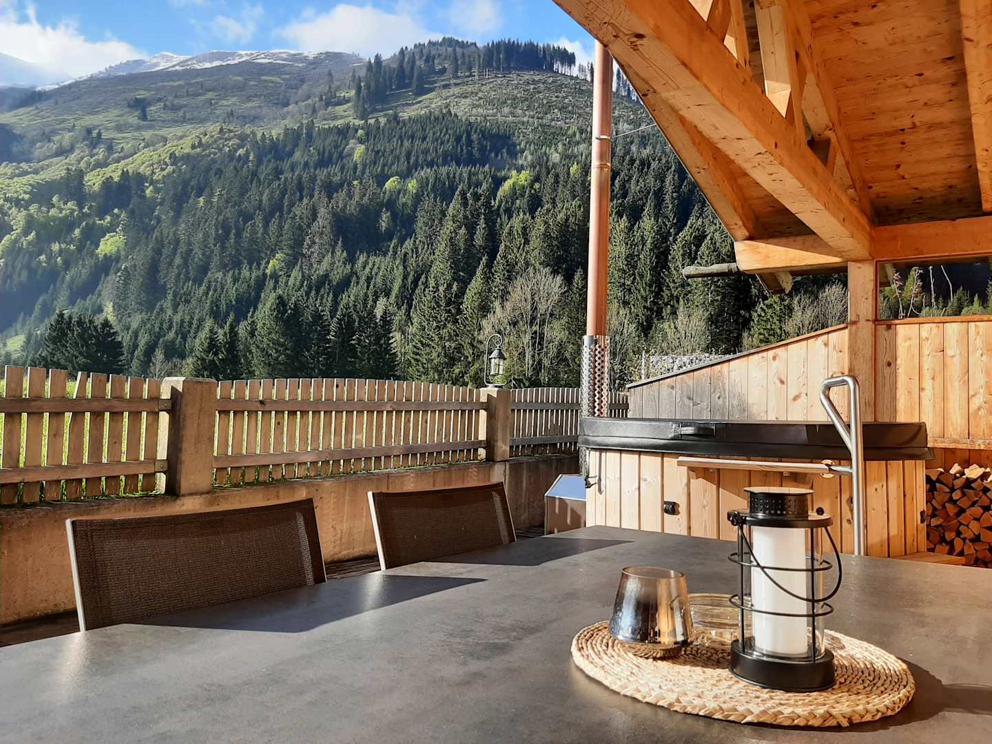 Riesige Terrasse mit dem Hot Tube und dem wunderschönen Ausblick