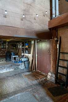 LobbyDer einzige Zugang von den Zimmern zum Frühstücksraum (1,75m hoch) durch die braune Tür neben dem Katzenkäfig, dem Gerümpel und der Abfalltonne.