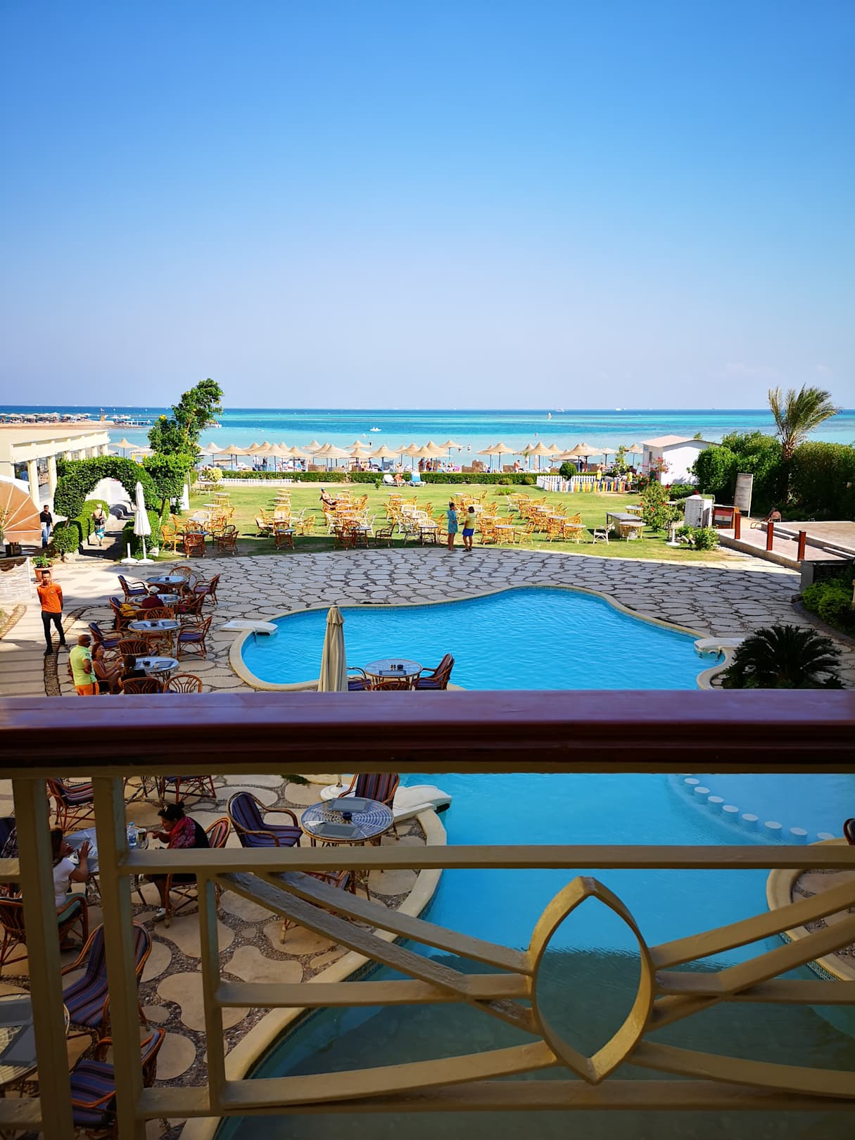 Blick von der Terrasse der Lobby auf den Garten und Strand