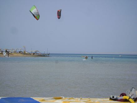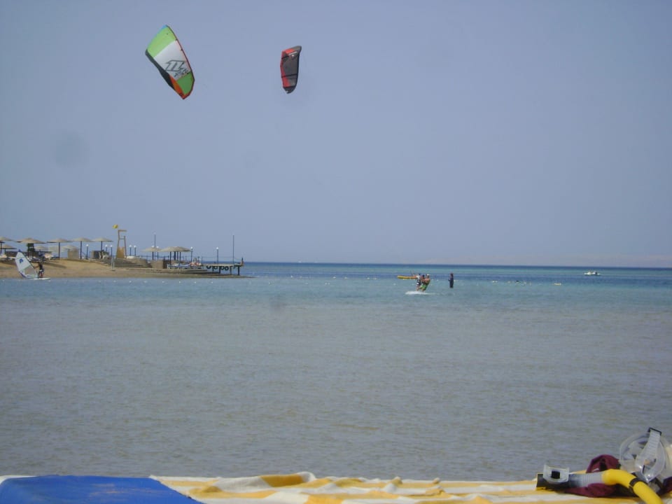 Strand mit Kitesurfern