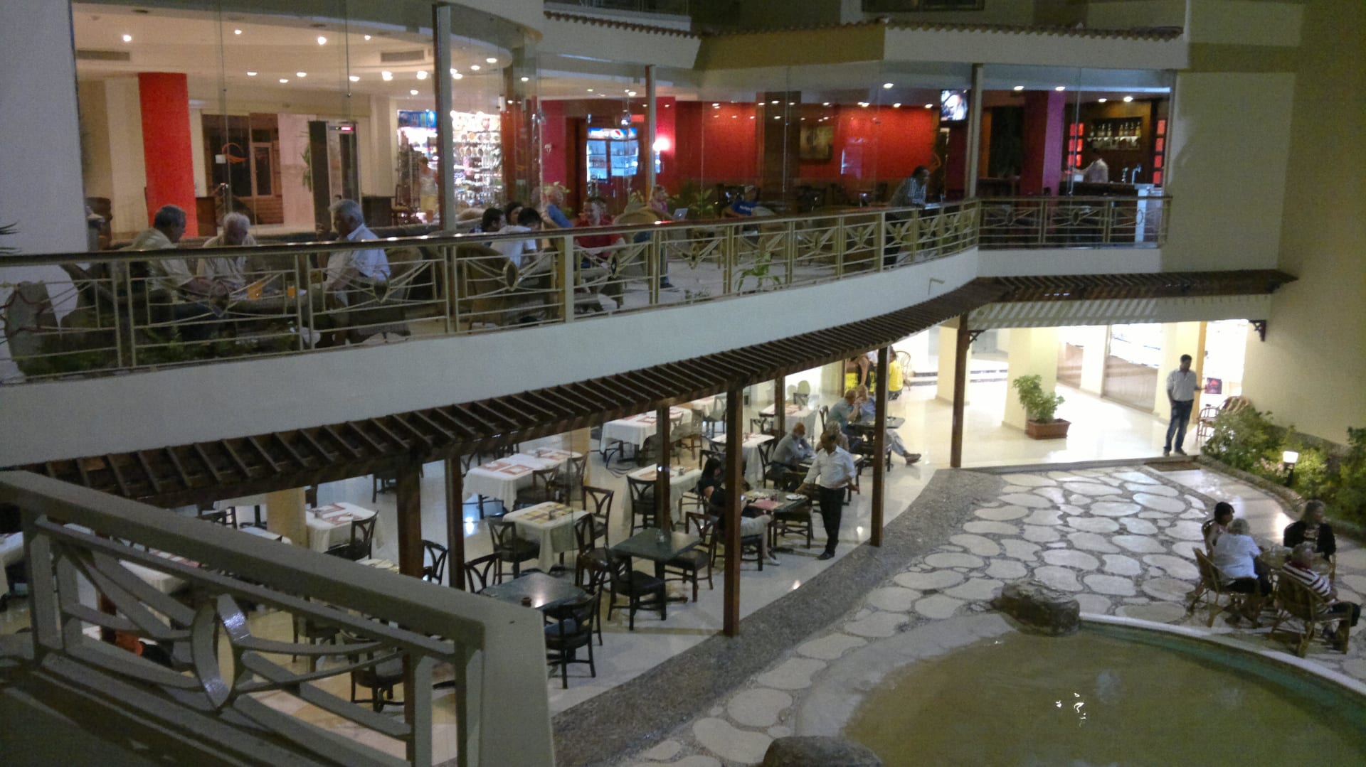 Terrasse; rechts die Bar & Lobby unten Restaurant