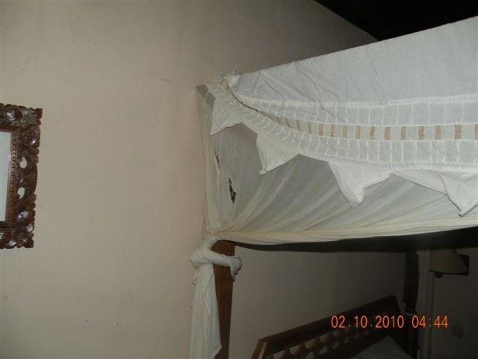 Zerrissener BaldachinEs dürften Vandalen vor uns im Zimmer gewesen sein, zerrissener Stoff beim Bett.