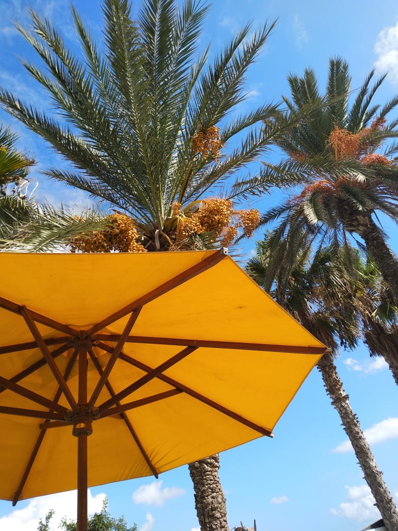 Gelbe Sonnenschirme und gelbe Liegen verschaffen Sonnenflair