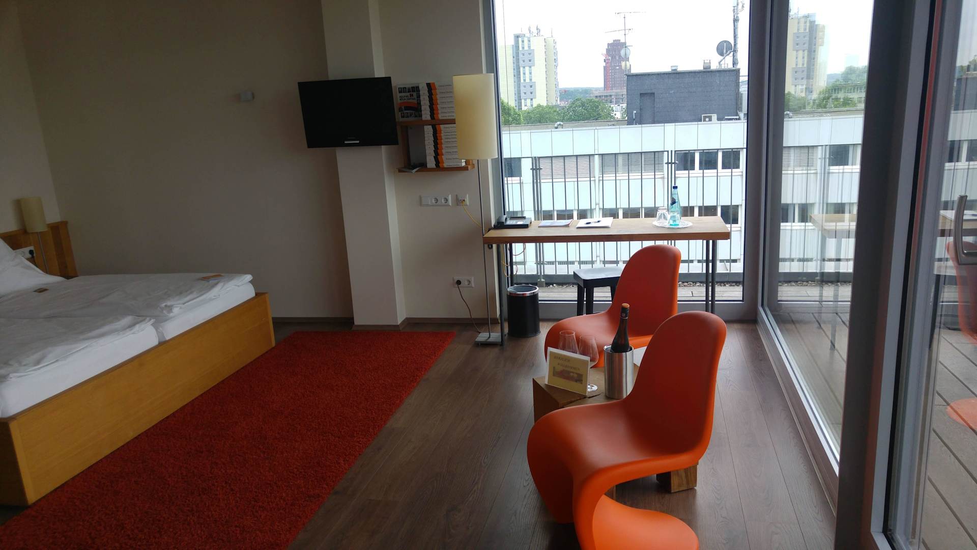 Flachbildfernseher, Schreibtisch und Sitzgruppe