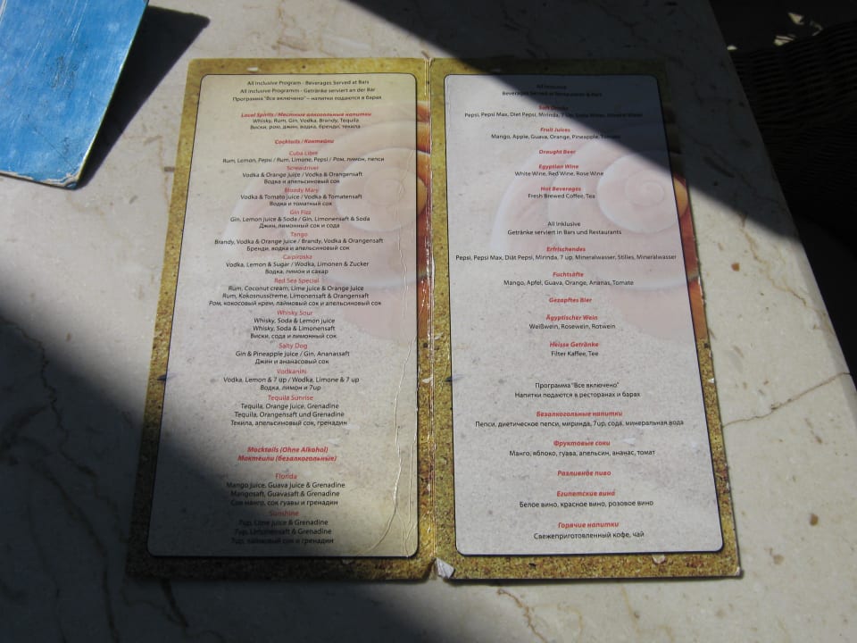 Die Speisen und Getränkekarten waren alle sehr schmuddelig und abgegriffen. Saubere, neue Karten sollte bei einen 5 Sterne Hotel doch das mindeste sein, was man seinen Gästen bietet.