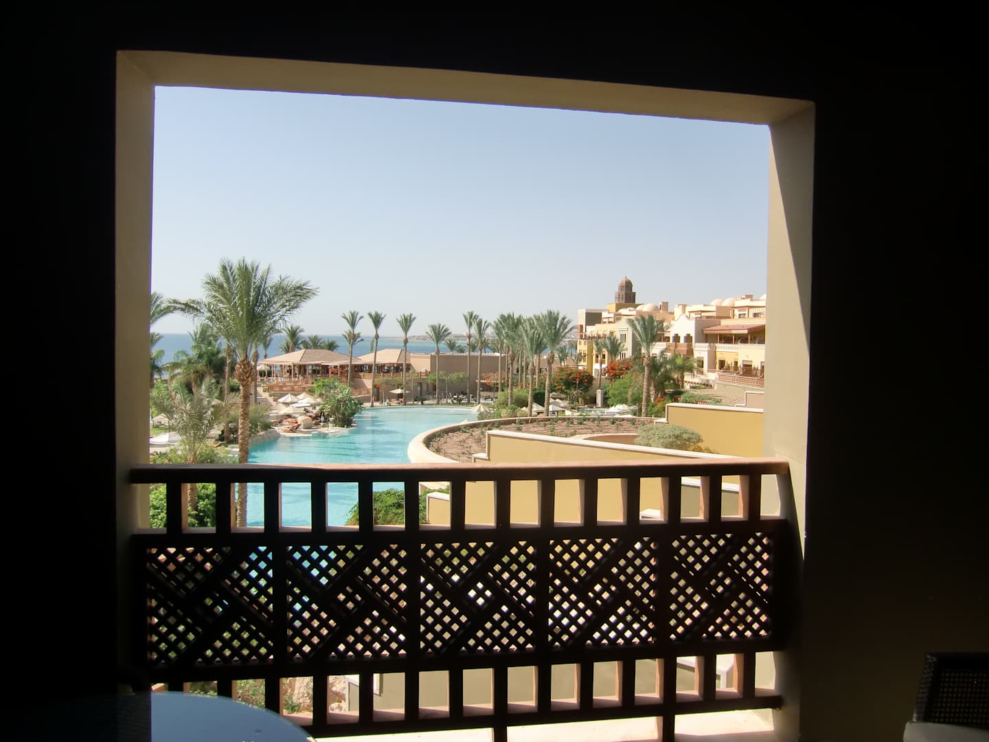 Blick vom Balkon auf einen Pool und das Meer