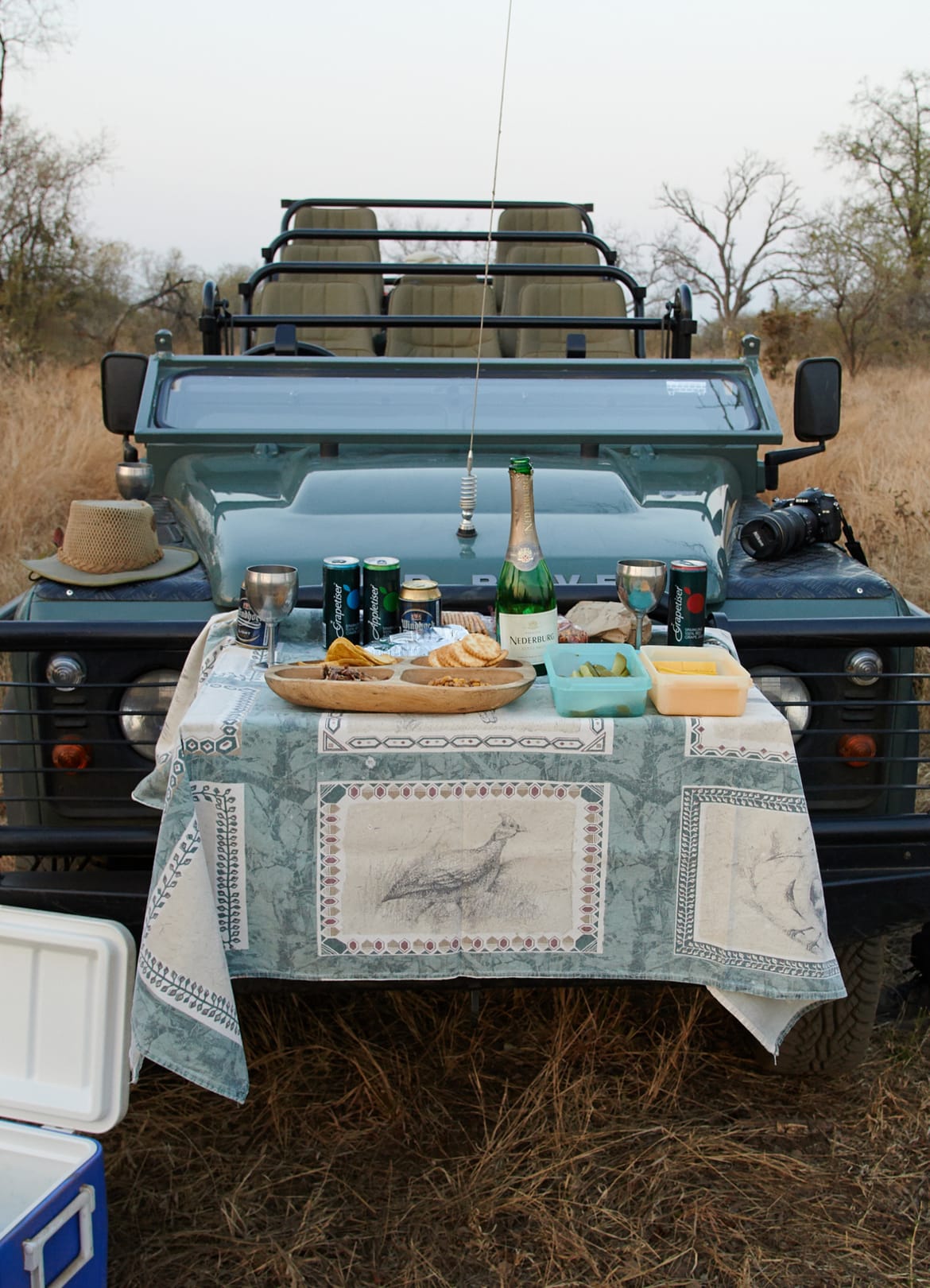Sun-Downer bei einer Safari (bei längeren Safaris gibt es morgens (vor den eigentlichen Frühstück) Kaffee/Tee/Milch und Snacks; abends einen Sun-Downer mit Drinks ud Snacks.