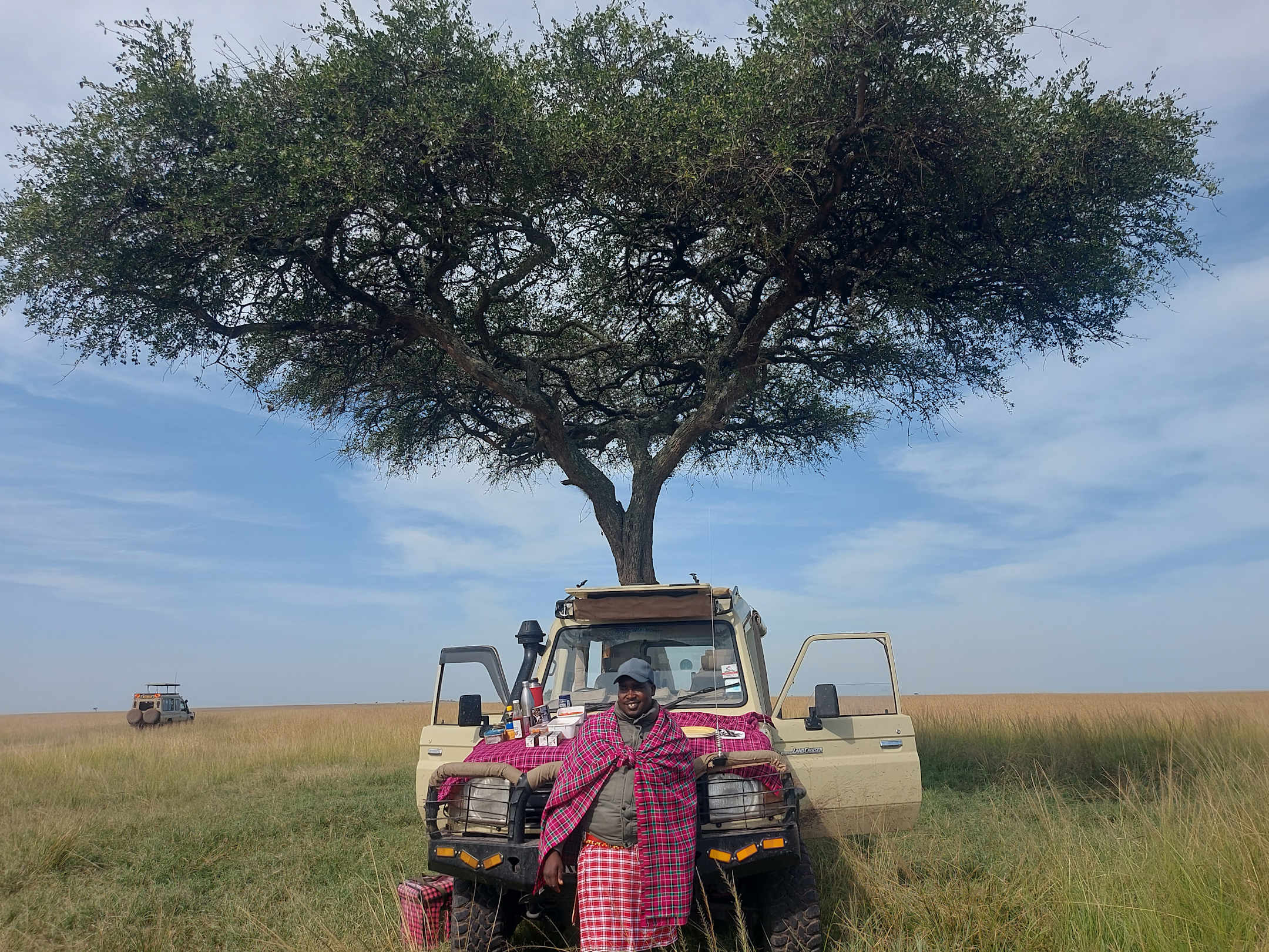 Fahrer Nickson vor seinem Jeep, auf der Kühlerhaube das präsentierte Frühstück