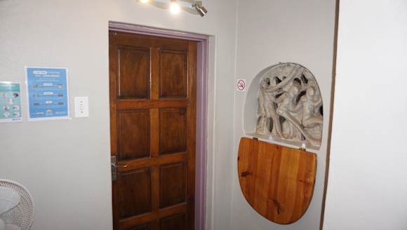 ZimmerZimmertür. Skulpturen in der Wand. Nach draußen offen, man kann aber alles mit "dem Brett" verschließen.