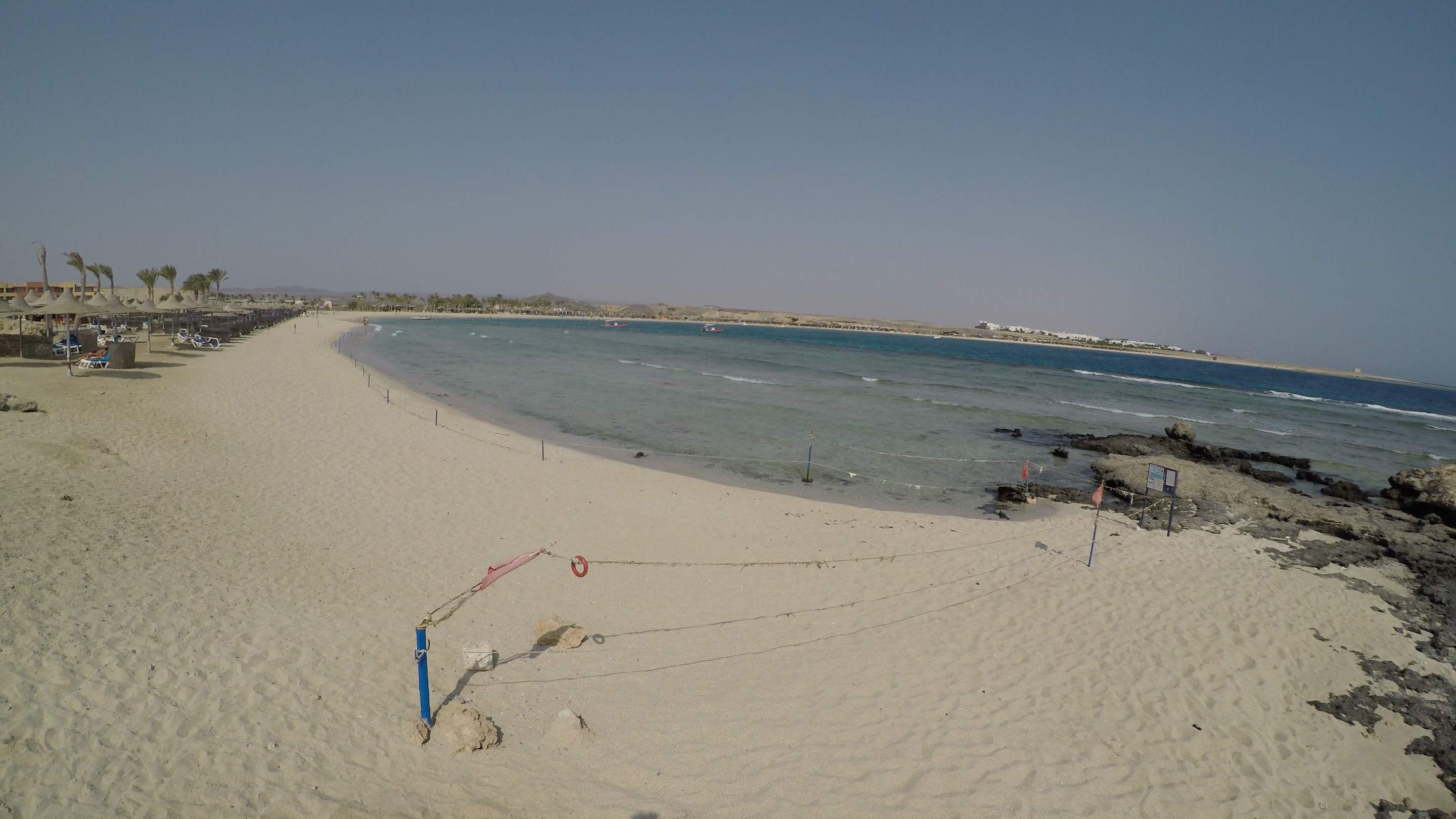 Die Bucht, vorne links die Sonnenschirme vom Malikia, rechts das Hilton