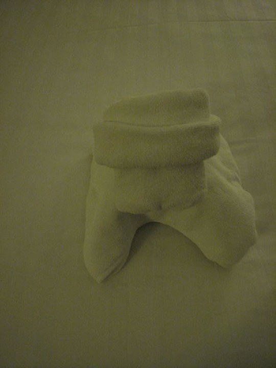 Handtuch wurde als Tier ~ Hund auf Bett gefaltet.