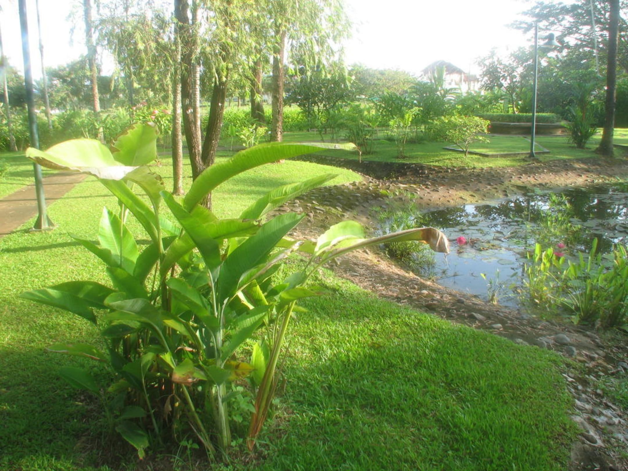 Banane mit andere Pflanzen sowie Teich.
