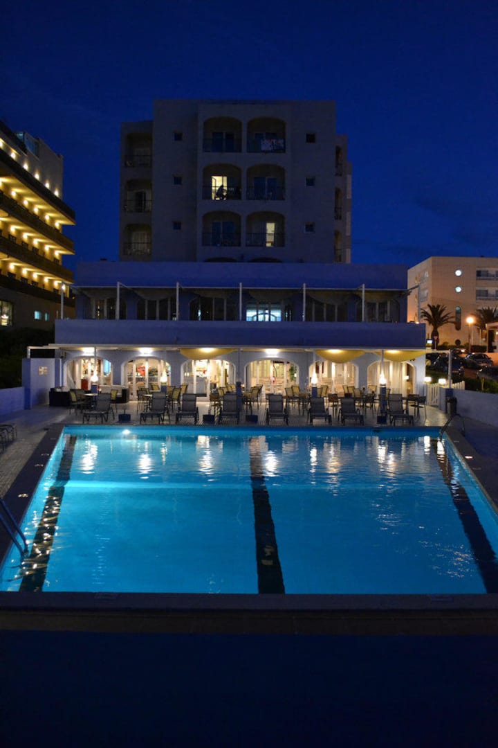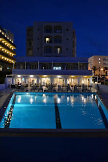 Wenn man am Pool liegt, hat man wahlweise entweder Blick auf's Meer oder Blick auf's Hotel... - hell erleuchtet hier der großzügige Barbereich, darüber der Speisesaal.